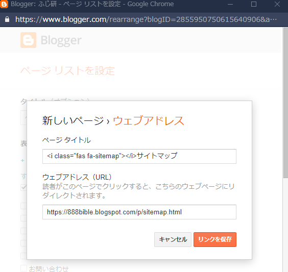 ページタイトル欄にこんな感じでページ名と FontAwesome のタグを入れてリンクを保存します。